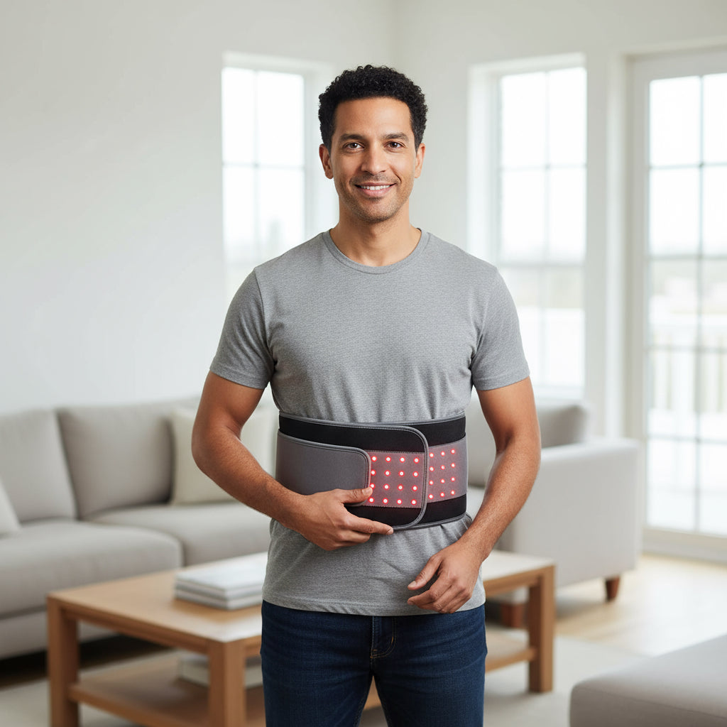 The belt warms gently but is never uncomfortably hot. It’s designed to provide soothing heat while the light penetrates deeper layers of muscle and tissue.